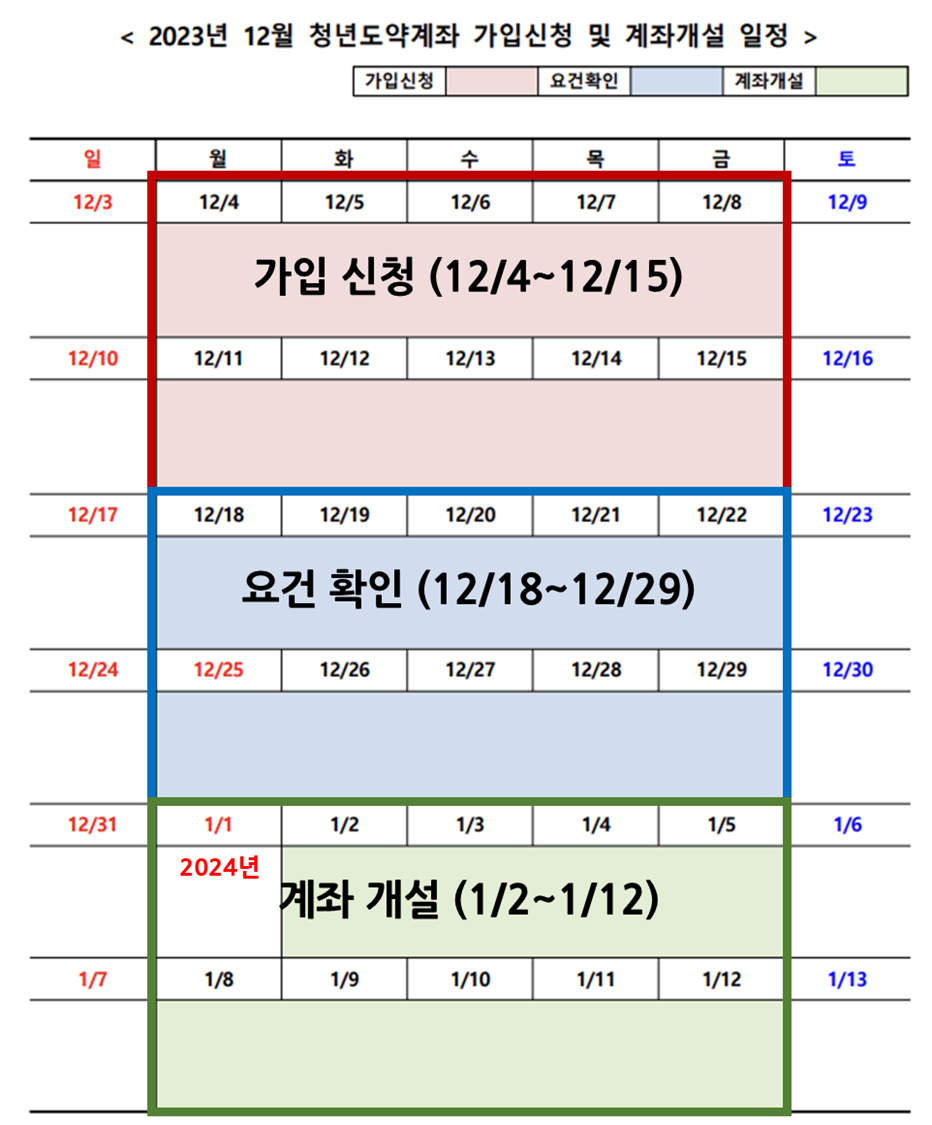1) 만 19세부터 34세까지의 청년을 대상으로 하며, 2023년 기준 2004년부터 1989년 사이 출생자가 대상이다. 또한, 군 복무를 한 경우 최대 6년까지 군 복무를 인정합니다. 2) 소득 직전 과세 해당 기간의 급여총액이 7,500만원 이하이거나, 종합소득금액이 6,300만원 이하이어야 합니다. (2023년 12월 신청시 2022년 소득기준) 소득이 확실하지 않다면 홈택스에서 확인하실 수 있습니다. 홈택스 → 즉시발급증명서 → 소득금액증명서 확인 3) 중위소득 중위소득 180% 이하 청년만 신청 가능합니다. 가구 구성원은 출생증명서상의 청소년과 배우자, 부모, 자녀, 형제자매(미성년자)를 기준으로 간주됩니다. 1인 가구의 경우 월 소득이 373만원 미만이어야 신청 가능합니다. 12월 신청기간 매월 초 회원가입을 신청하실 수 있습니다. 2023년 12월 회원기간은 12월 4일 월요일부터 12월 15일 금요일까지 입니다. 모든 은행에서 1인 1개 계좌만 개설 가능하며, 현재 청년희망적금을 보유하고 계신 경우에는 청년도약통장 가입이 불가능합니다. 종합금융소득세 과세 대상으로 확인되면 지급이 정지된다는 점도 알아두시기 바랍니다. 은행별 금리비교 청년도약통장은 국민, 신한, 하나, 우리, 농협, 기업, 부산, 대구, 광주, 전북, 경남, SC 등 11개 은행이 취급하고 있다. 기본금리는 4.5%로 모든 은행이 동일하다. 가입하신 은행마다 우대금리가 다르므로 본인에게 맞는 은행을 선택하시면 됩니다. 신청 기간 내에 원하는 은행을 선택한 후, 뱅킹 앱을 통해 비대면 가입이 가능합니다. 사회에 처음 오신 분이라면 가입하는 것이 좋습니다.